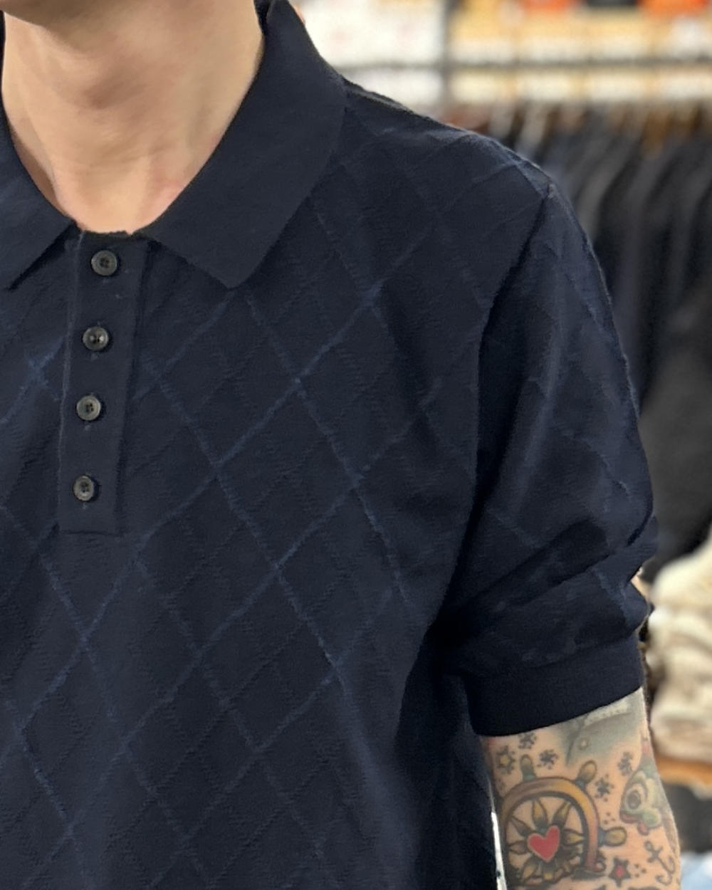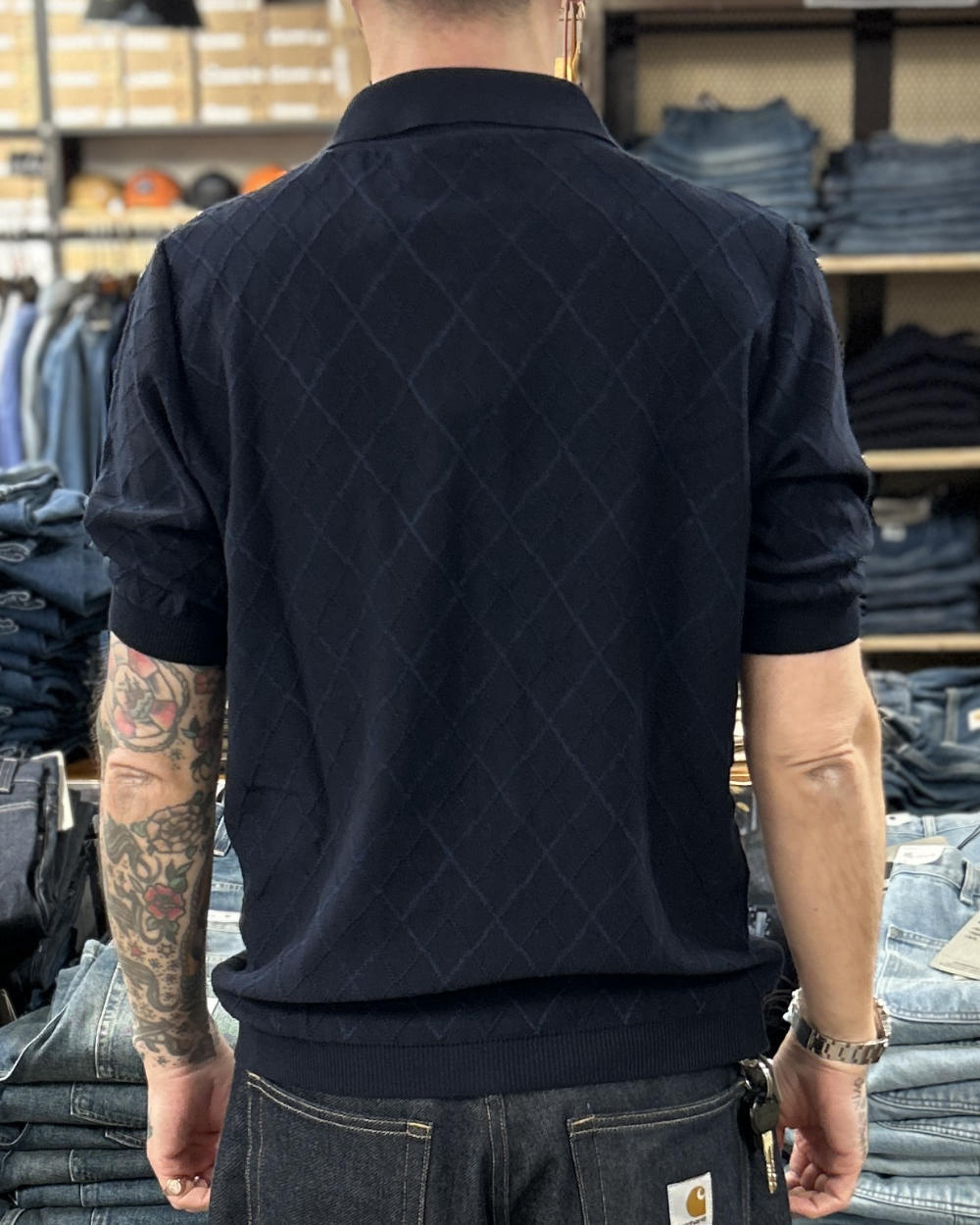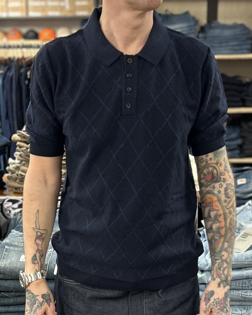 universal works jonny knit shirt dark navy cotton lace knit